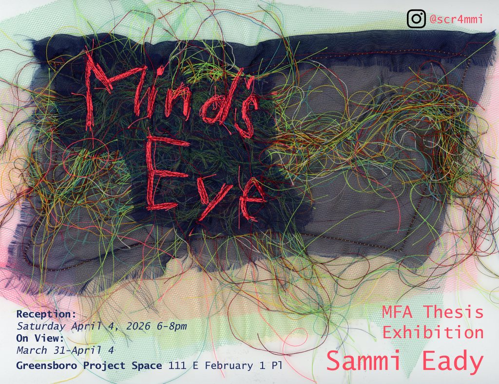 Mind’s Eye MFA Thesis Exhibition by Sammi Eady Exhibition: March 31 – April 4, 2026 Reception: Saturday, April 4th, 6-8p Mind’s Eye is an exhibition revealing the contention between how the mind and the body remember a space. From childhood homes, first jobs, and card games, landmarks from my past are mapped through ongoing perception… Continue reading…