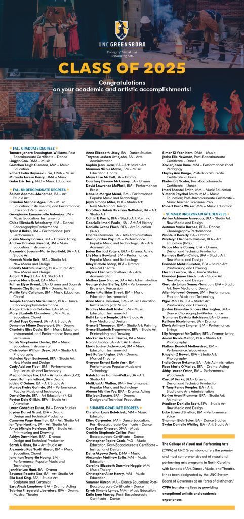 “UNCG has a small school feel. It’s been easy to find friends outside of my major. I spent my first year going to many events and exploring all the different clubs on campus. I found my place here within the School of Art and in other groups, too.”